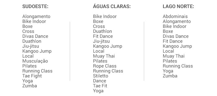 Para quem gosta de alternar os exercícios ou pretende inserir outra modalidade na rotina, a Runway oferece boxe, bike indoor e yoga em todas as unidades. Confira abaixo a lista completa de todas as modalidades: