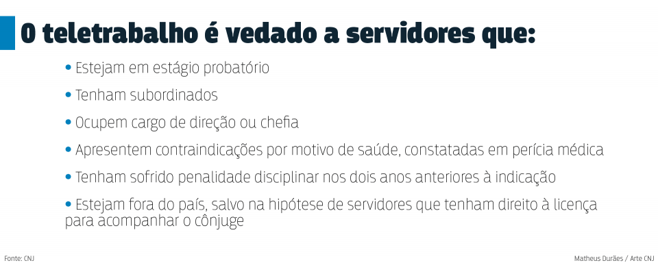 Existem critérios para que o servidor realize suas tarefas fora das dependências judiciárias. Ele deve produzir mais do que os servidores presenciais, deve comparecer nas dependências do órgão sempre que convocado, deve manter os telefones ativos, consultar a caixa de correio eletrônico diariamente e outras exigência. Caso não as cumpra, o supervisor do servidor poderá suspender imediatamente sua condição de trabalho remoto.