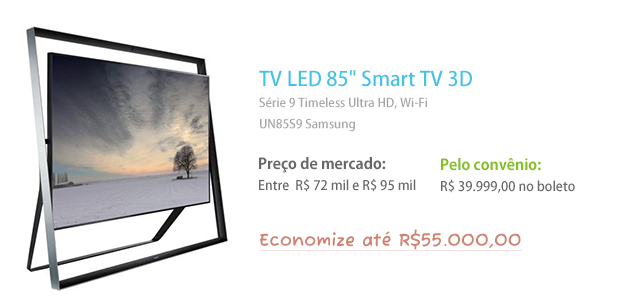 Com preços entre R$ 72 mil e R$ 95 mil no mercado convencional, a TV LED 85″ Smart 3D Série 9 Timeless Ultra HD, Wi-Fi (UN85S9) pode ser adquirida através do convênio por R$ 44.999,00, valor parcelado em até 10 vezes, ou por R$ 39.999,00 no boleto.