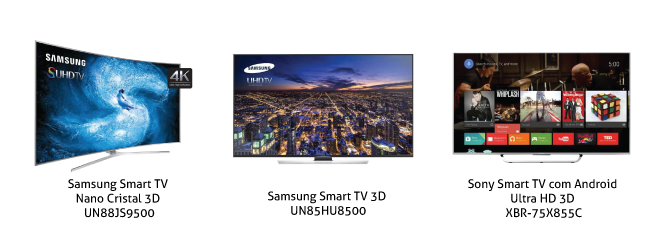 Para começar com um modelo da Samsung, a Smart TV Nano Cristal SUHDTV oferece um design com tela curva e resolução em 4K. São 88 polegadas na tela e o aparelho vem com Wi-Fi integrado. Estão incluídas tecnologias para oferecer uma qualidade mais nítida de imagem, além de cores e níveis de contraste mais reais. Por dentro está um processador octa-core para manter um funcionamento fluido das funções smart, além de rodar apps como Netflix, mensageiros e redes sociais.
