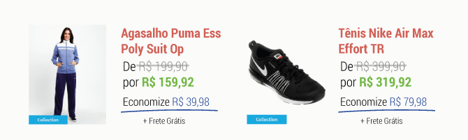 Para a nossa simulação, selecionamos o Agasalho Puma Ess Poly Suit Op e o Tênis Nike Air Max Effort TR.