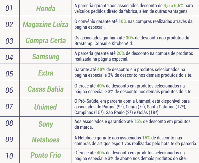 Novidade na lista de setembro, o Ponto Frio obteve 420 cliques, ficando na décima posição. A parceria garante aos associados desconto de até 40% em produtos selecionados na página especial (disponível na área restrita) e 3% de abono nos demais produtos do site.