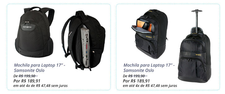 Sinônimo de qualidade e durabilidade, a marca Samsonite é uma das marcas mais lembrada por viajantes. Há mais de cem anos no mercado, as malas e mochilas oferecerem design inovador e incorporam inovações tecnológicas para o uso cotidiano, seja para viagens a trabalho ou em família.