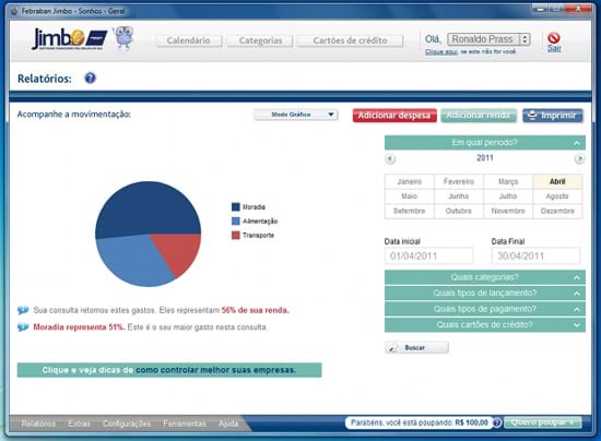 Com uma interface que lembra um painel de controle, o Jimbo permite que o usuário visualize o resumo das movimentações e analise gráfica.
