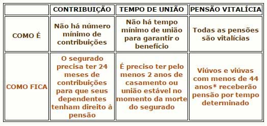 Ainda em relação aos cônjuges e companheiros, o benefício passa a ser, em regra, temporário. O pagamento da pensão será vitalício apenas para viúvos e viúvas com mais de 44 anos. Os demais beneficiários terão direito à pensão por um período que pode variar de três a 15 anos (como no quadro acima), de acordo com a atualização da tabela de mortalidade do Instituto Brasileiro de Geografia e Estatística (IBGE).
