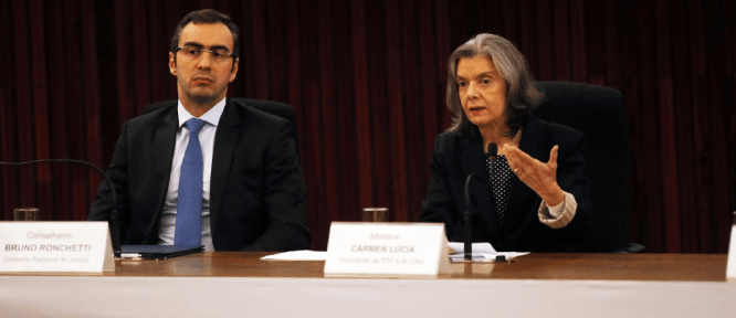 Ministra Carmem Lúcia ao lado do conselheiro Bruno Ronchetti durante o lançamento do relatório. Foto: Gláucio Dettmar/Agência CNJ.