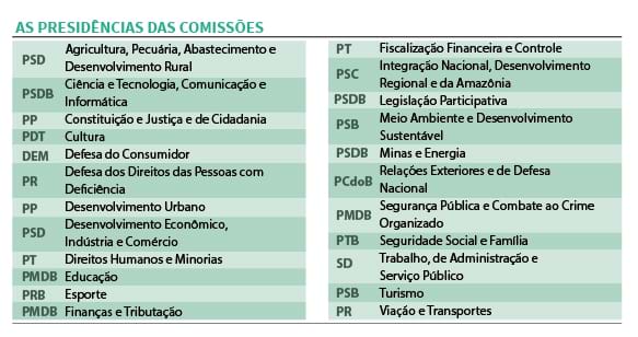 O deputado André Moura (SE), líder do PSC, reconheceu que as negociações foram longas. “Tivemos reuniões na semana passada, ontem e ainda hoje pela manhã para definir”, disse. Seu partido ficou com a Comissão de Integração Nacional, Desenvolvimento Regional e da Amazônia.