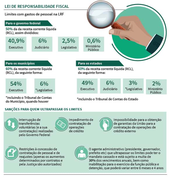 A lei instituiu limites para esses gastos e estabeleceu sanções para os administradores públicos em caso de descumprimento (veja quadro). O governo federal, por exemplo, passou a poder gastar apenas 40,9% da sua receita corrente líquida com o funcionalismo público. Limites parecidos foram instituídos para estados e municípios.