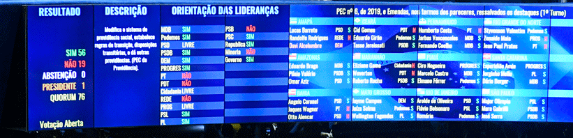 Painel de votação do texto base da Reforma da Previdência no Plenário do Senado. Foto: Marcos Oliveira/Agência Senado.